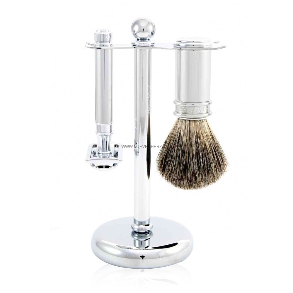 Ein hochwertiges verchromtes Rasierhobel- und Rasierpinselset inklusive luxuriösem Ständer
